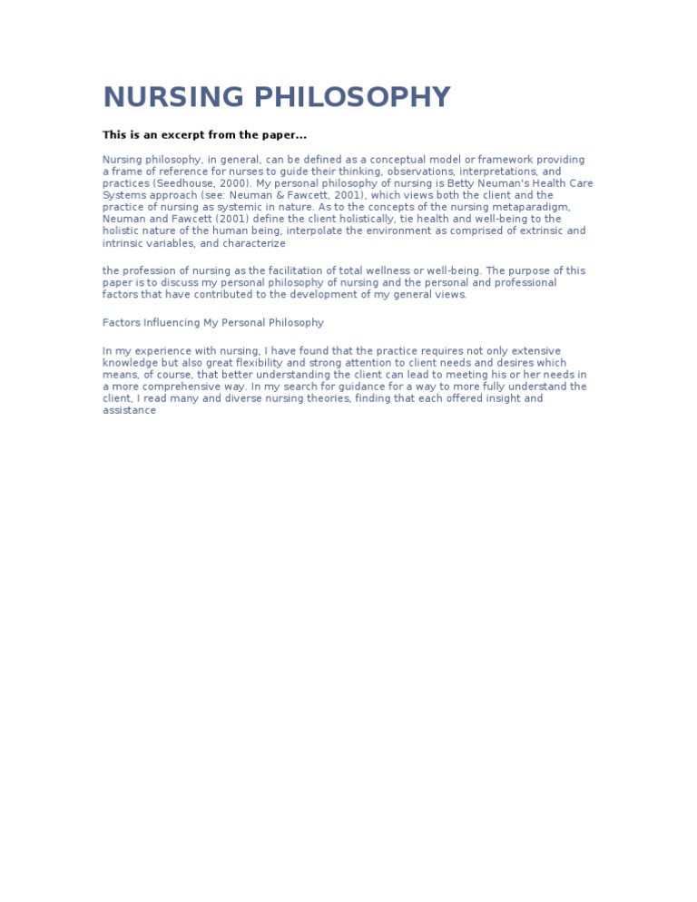 CALL FOR PAPERS. For IPoNS Conference Special Issue 'Personhood: philosophies, applications and critiques in healthcare'. We welcome submissions for consideration for the IPONS Conference Special Issue to be published in Nursing Philosophy in early The theme for the special issue is based on the coming International Philosophy of Nursing Conference in June Personhood: The goal of this paper was to discuss each component of my personal nursing philosophy in relation, how I arrived at my belief, how I encountered each in my practice and how each may facilitate my personal contribution to the current body of nursing knowledge. My personal philosophy of nursing incorporates components of the traditional nursing metaparadigm (Monti & Tingen, ) while also Oct 16, · Nursing Philosophy. Words: Length: 2 Pages Document Type: Paper #: Read Full Paper. Nursing. Letter of Introduction. As an advance practice nurse, I intend to apply my education and professional experience to improving patient outcomes. A holistic nursing philosophy and commitment to caring are the crucial components of my professional character